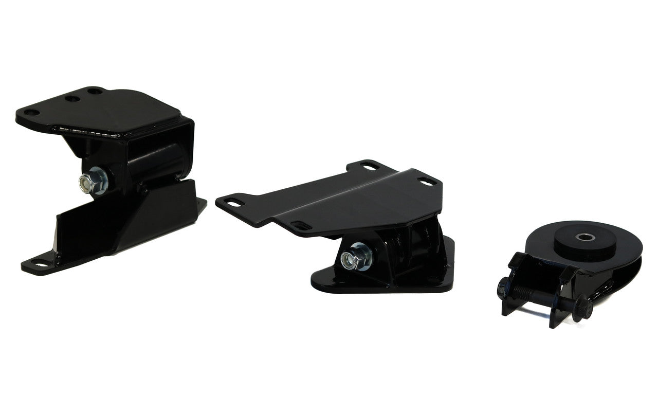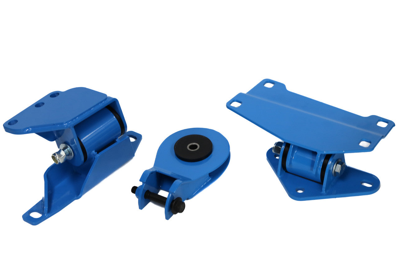 These mounts are designed to completely support the engine and transmission with durometer options to suit all styles of driving. All of our bushings can be replaced at any time. Mounts improve drive line response by inhibiting driveline lash, putting all that motion to the task of moving the car along. Say goodbye to wheel hop and hello to smoother shifts with this complete mount kit!